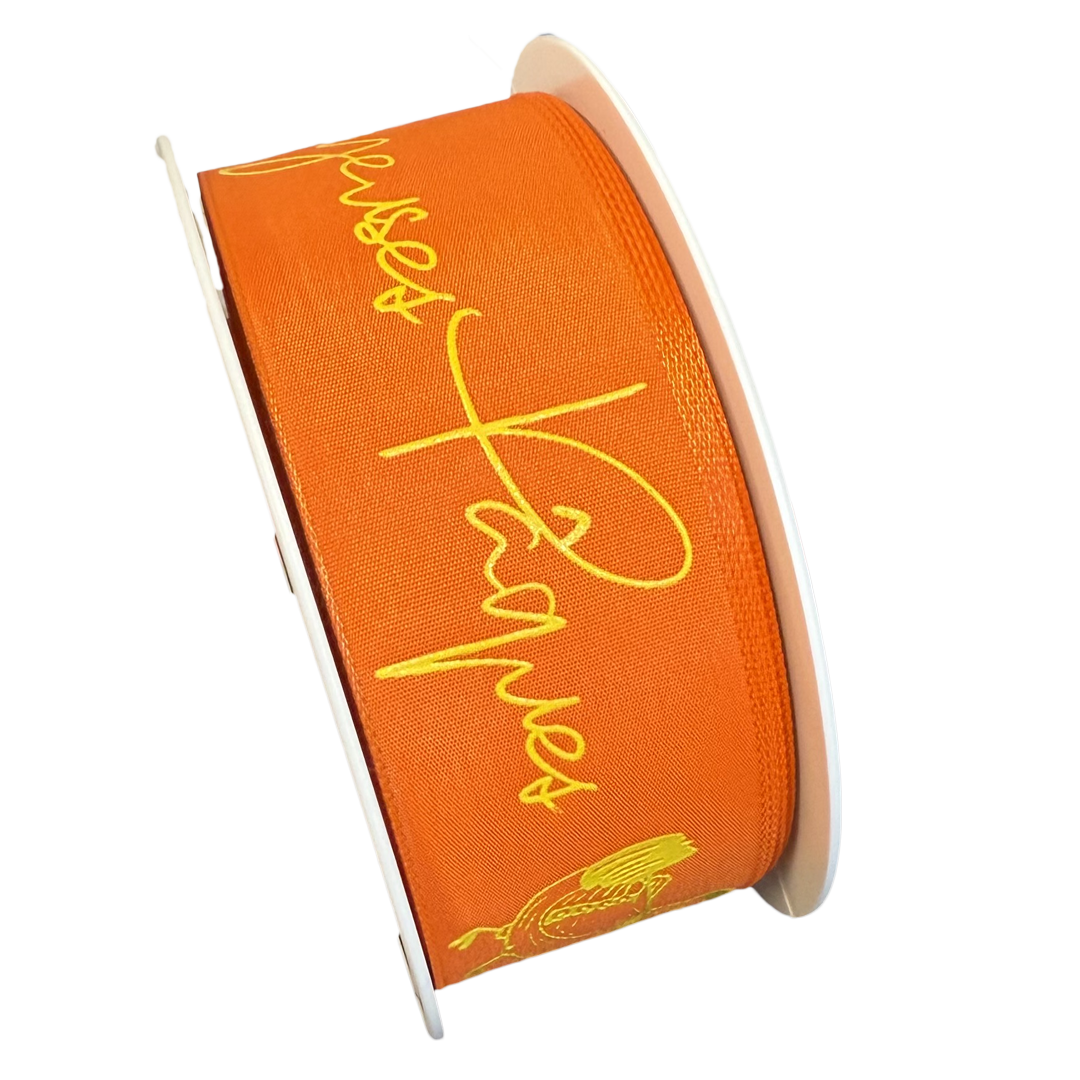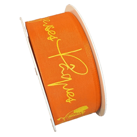 Wired taffeta ribbon, orange and yellow, with a hen and “Joyeuses Pâques” lettering. 40mm x 25m / 1.6in x 27yds