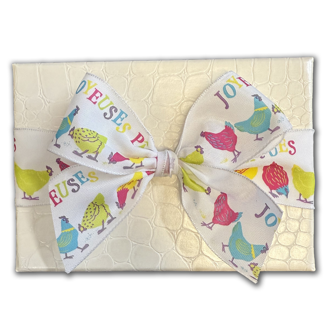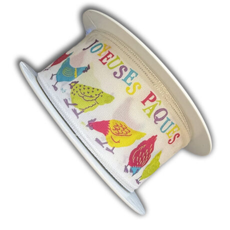 White brass-plated ribbon, in taffeta with motifs, Multicoloured Hens.