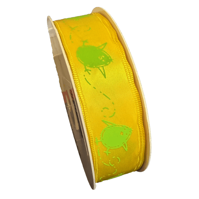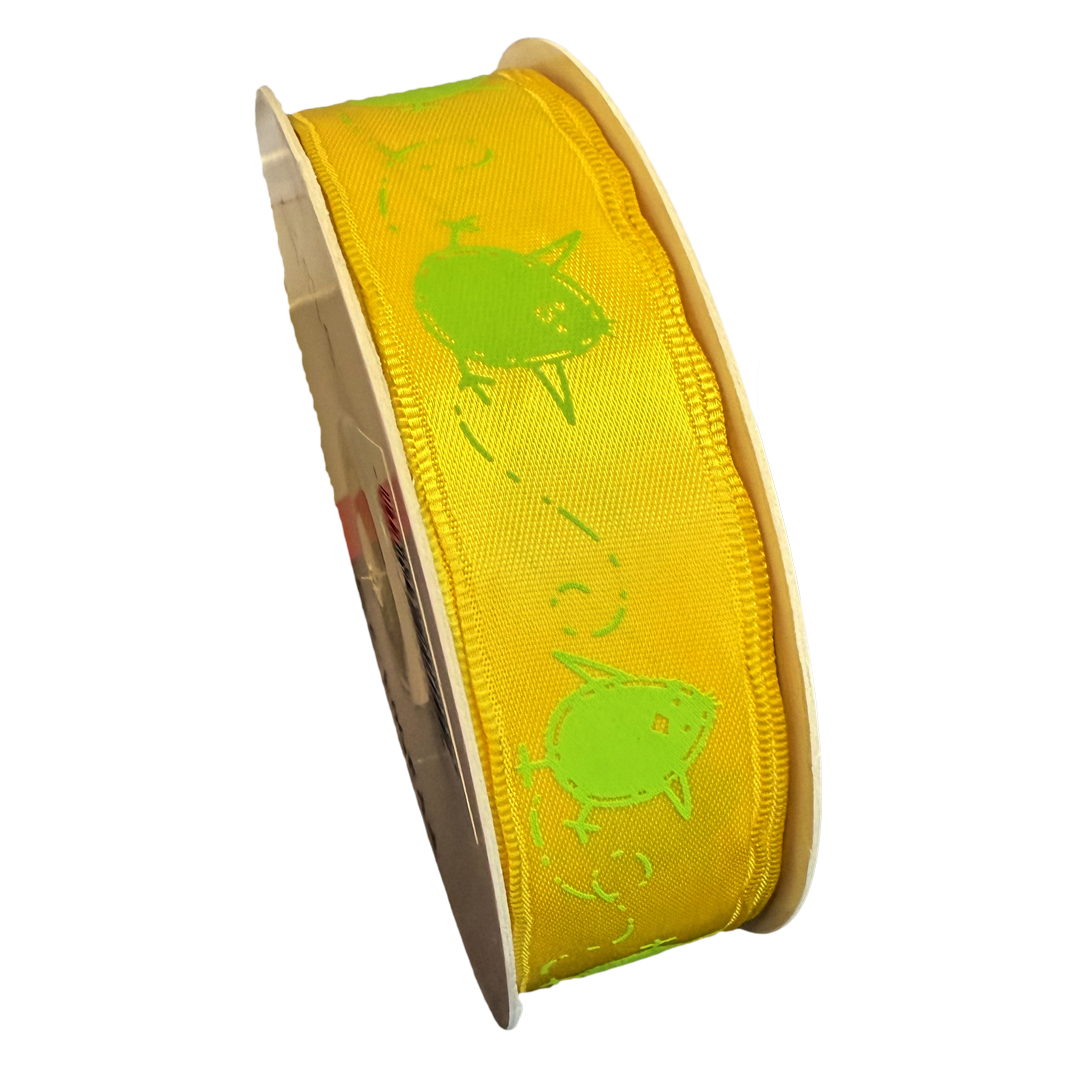 Satin ribbon. Frolicking chick, wired edges, yellow and green.