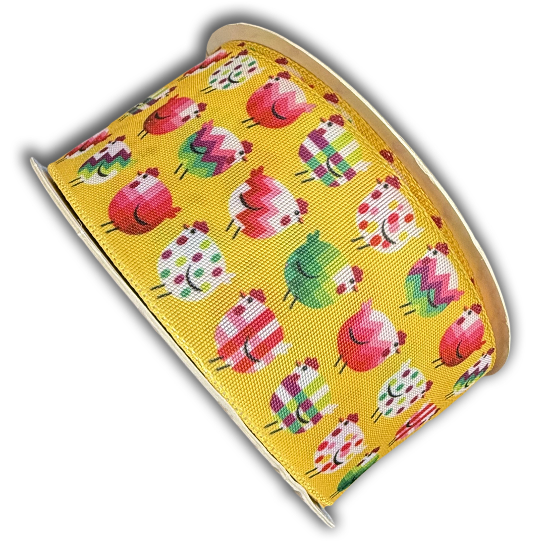 Yellow wired ribbon, in taffeta with patterns, multi-colored Chickens.